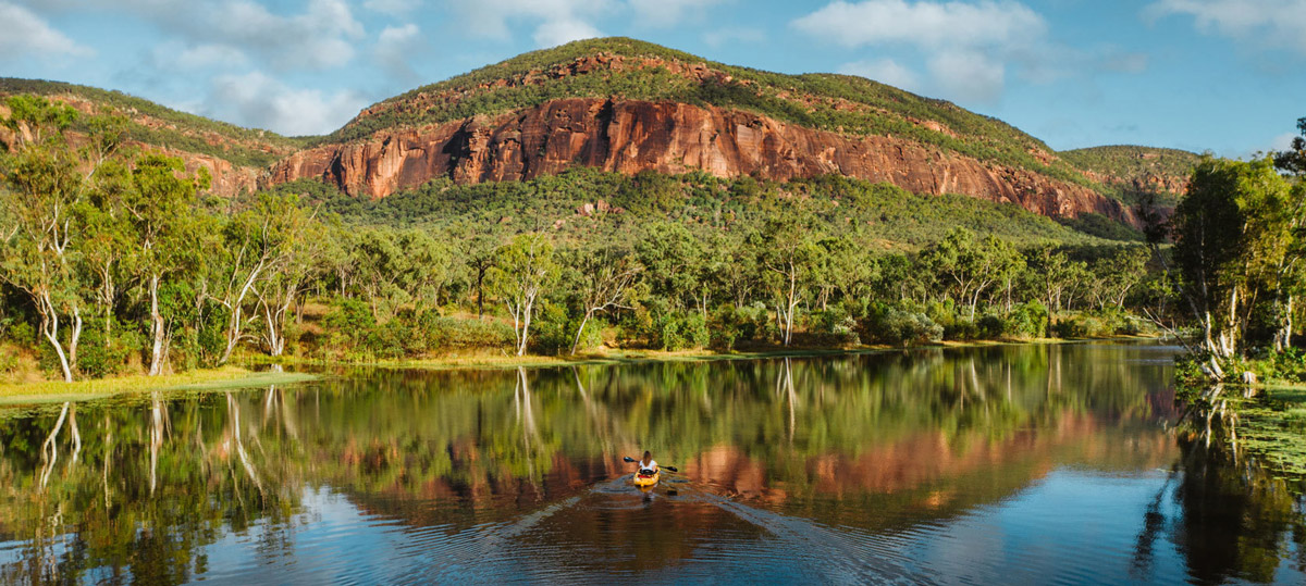 The Outback Room, perfect for those travelling individually or as a duo, is situated on the water’s edge of a sparkling eucalyptus-fringed weir and captures the majestic beauty and moods of the 18-kilometre long sandstone escarpment of Mount Mulligan.