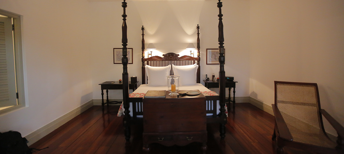 Bedroom features include: a twin or king-size four-poster bed, writing desk, dining table, spacious bathroom with twin vanities, free-standing bathtub, separate shower and toilet. Chamber features include: bathroom with a large shower, free-standing bathtub, and toilet, a four-poster king-size or twin bed arrangement, a planter's chair, writing desk and dining table. Suite features include: bathroom with a free-standing bathtub, twin vanities, separate toilet and shower, a twin or king-size four-poster bed and arched, shuttered windows, a lounge furnished writing desk, dining table, planter's chair and 'pettagama' chest. Garden House features include: a king-size four-poster bed, writing table, dressing cabinet, a spacious bathroom with twin vanities, a free-standing bathtub, toilet and separate shower, an internal stairway connecting the sitting room to the upper level, a pantry serviced by a private butler. Amangalla suite features include: exactly the same size, both bedrooms are furnished with four-poster beds, planters' chairs, pettagama chests, chaises lounges, writing desks, dining table in its lounging area.